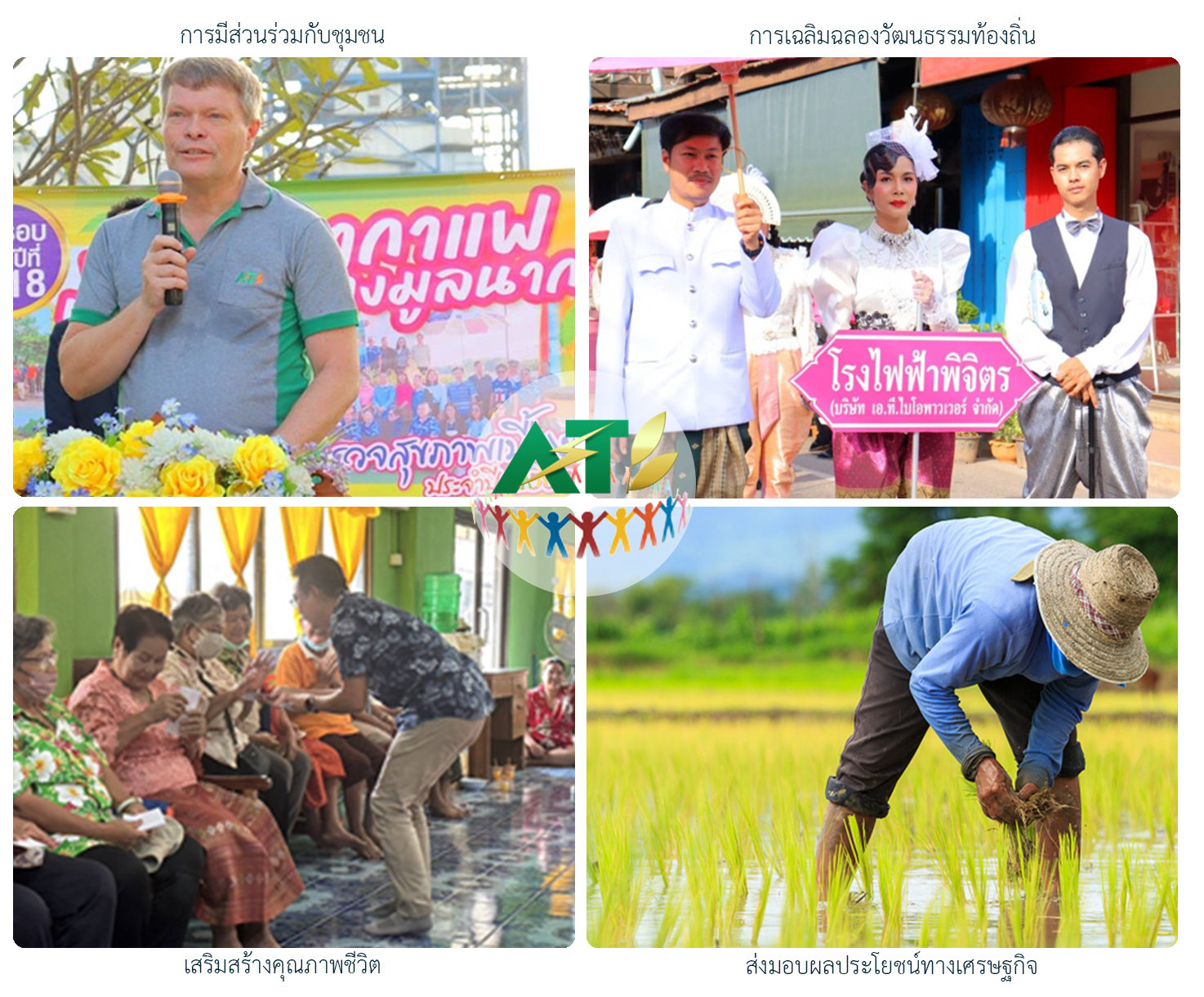 เอ.ที. ไบโอพาวเวอร์ เสริมสร้างคุณภาพชีวิตของผู้คนจำนวนมาก ในหลาย ๆ ด้าน รวมถึงการเสริมศักยภาพทางเศรษฐกิจ (ดูสไลด์ถัดไป) การศึกษา สิ่งแวดล้อม (อากาศที่สะอาด) และการดูแลผู้ที่อ่อนแอที่สุดในชุมชน