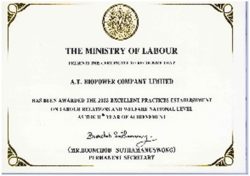 ใบรับรองการรับรู้ความมุ่งมั่นของ เอ.ที. ไบโอพาวเวอร์ ในการจัดการและติดตามสิ่งแวดล้อมอย่างเป็นระบบตลอดจนการพัฒนาอย่างต่อเนื่อง